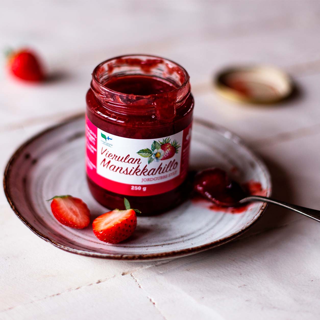 Vierulan mansikkahillo on keitetty tilan omista mansikoista mummon herkullisella reseptillä. Mansikkahillossa nousee esille tuoreiden mansikoiden makea maku.