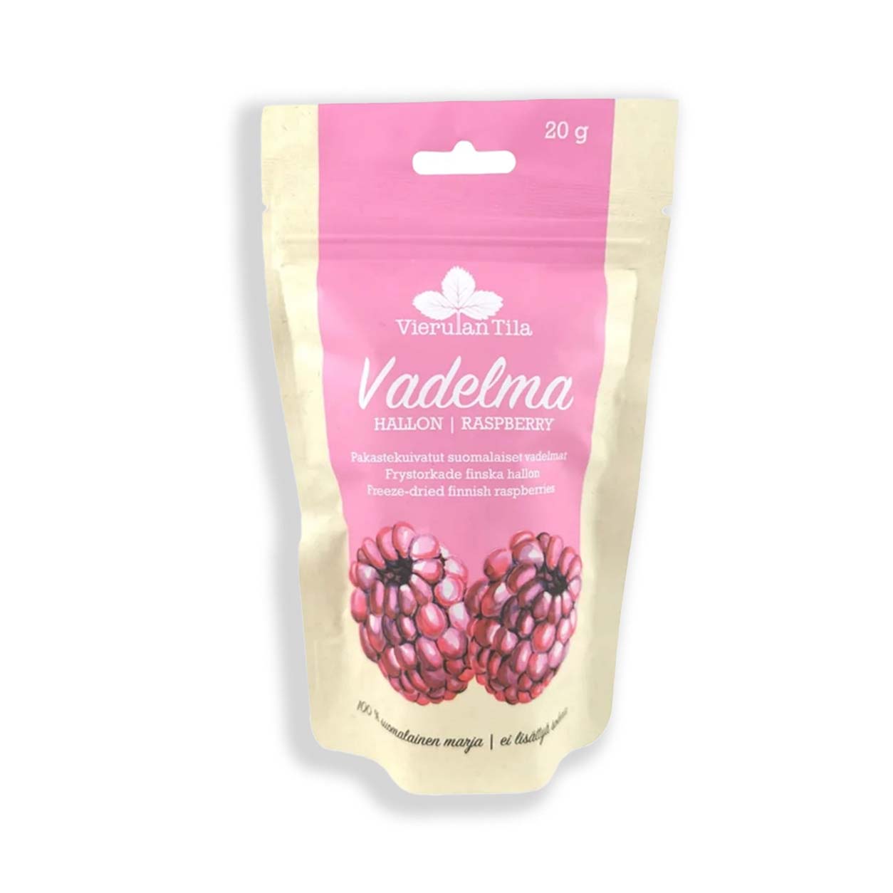 Vierulan pakastekuivatut vadelmat ovat lajikkeeltaan Glen amplea, jossa on raikas, hieman kirpeä ja vahva vadelman maku.