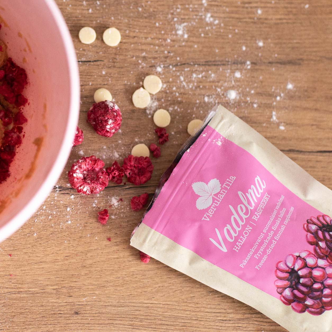 Pakastekuivatut vadelmat ovat täysin lisäaineettomia ja sisältävät ainoastaan suomalaista vadelmaa.