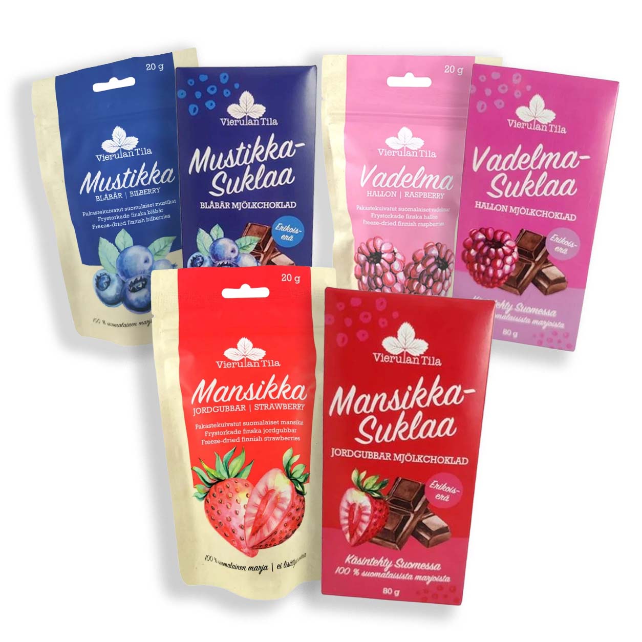 Vierulan omilla, 100 % suomalaisilla marjoilla maustetut suklaat on valmistettu käsityönä Suomessa.