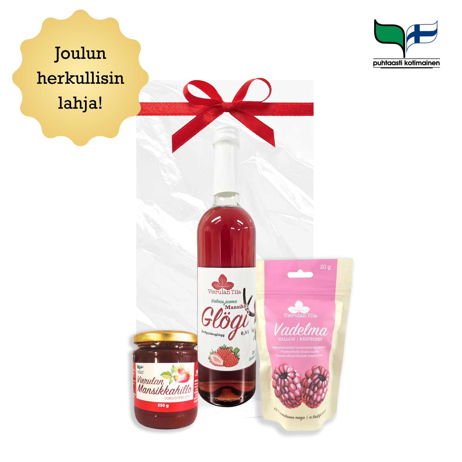 Muista lahjansaajaa pienellä, mutta makealla lahjalla, jossa maistuu aito suomalaisen marjan maku glögin ja pakastekuivattujen marjojen muodossa. Tämän lisäksi voit valita pakkaukseen joko pahis- tai marjahillon.