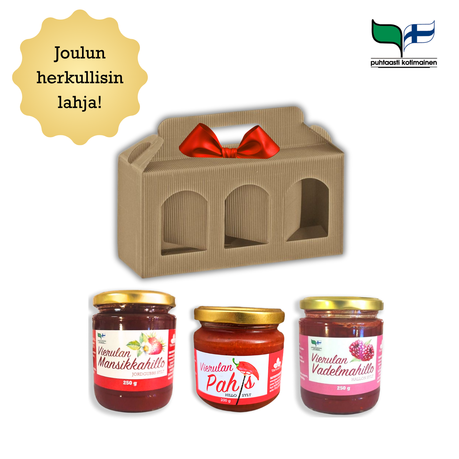 Hillotrio sisältää nimensä mukaisesti kolme eri hilloa. Vierulan tilan keittiössä valmistetut mansikkahillo, vadelmahillo ja Pahis muodostavat yhdessä makoisan trion, joka sopii vaikka lahjaksi annettuna. Vierulan tilan omista marjoista valmistetut marjahillot ja pienen jälkipotkun makunystyröihin jättävä Pahis sopivat moneen makuun, lapsille ja aikuisille.