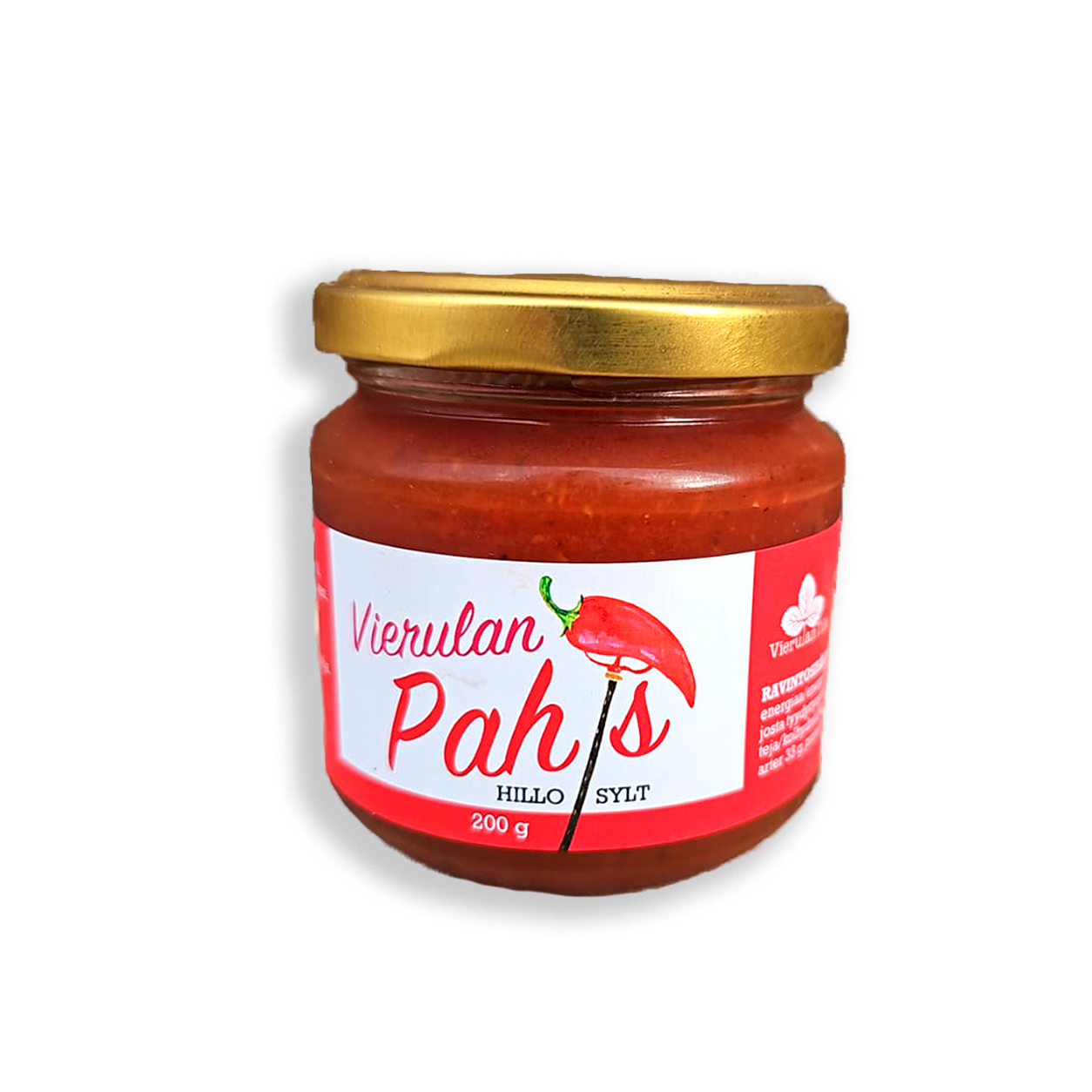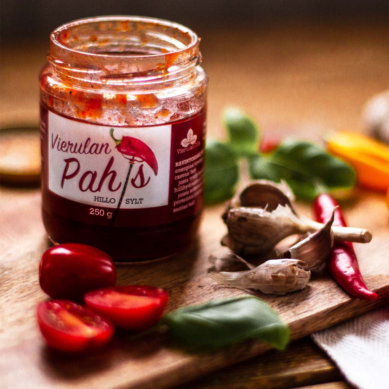 Vierulan Pahishillo on suloisen tulinen hillo, jonka koukuttavan hyvä maku on saatu aikaan salaisella reseptillä tomaatin, paprikan ja chilin ympärille.